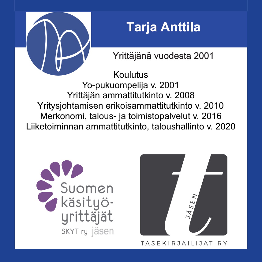 Perustin Kirjanpitopalvelu Tarja Anttilan vuonna 2016 valmistuessani talous- ja toimistopalveluiden merkonomiksi. Yrittäjänä, ompelijana ja kauppiaana olen toiminut vuodesta 2001 lähtien. Aloitin yrittäjänä valmistuttuani yo-pukuompelijaksi. Vuosien varrella olen suorittanut yrittäjän ammattitutkinnon ja yritysjohtamisen erikoisammattitutkinnon sekä taloushallintoon liittyen merkonomin tutkinnon ja liiketoiminnan ammattitutkinnon. Osallistun säännöllisesti kirjanpito- ja verotusasioihin liittyviin koulutuksiin sekä seuraan alan julkaisuja ja ajankohtaisia tapahtumia. Olen mukana myös alan verkostossa, josta saan tarvittaessa tukea kokeneemmilta kollegoilta.